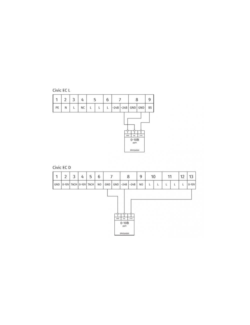 DP WQ40200 Czujnik posiada dwa wyjścia analogowe: 0-10 V i 4-20 mA. Wyjście analogowe umożliwia płynną regulację prędkości obrotowej wentylatora (wymagane zastosowanie wentylatorów z silnikiem EC lub dodatkowego regulatora obrotów z wejściem 0…10 V).