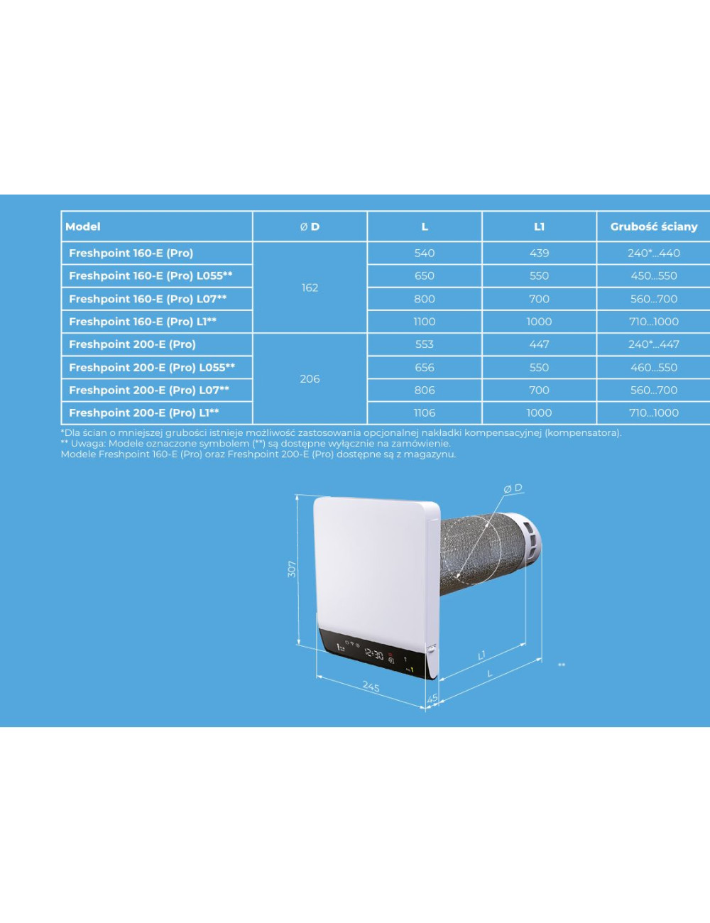 Jednostkę można montować w ścianach o grubości od 240 do 1000 mm. Dzięki możliwości wyboru odpowiedniej długości jednostki (450, 550, 700 lub 1000 mm) oraz zastosowaniu elastycznych zestawów kompensacyjnych, dopasowuje się ona do grubości ściany.