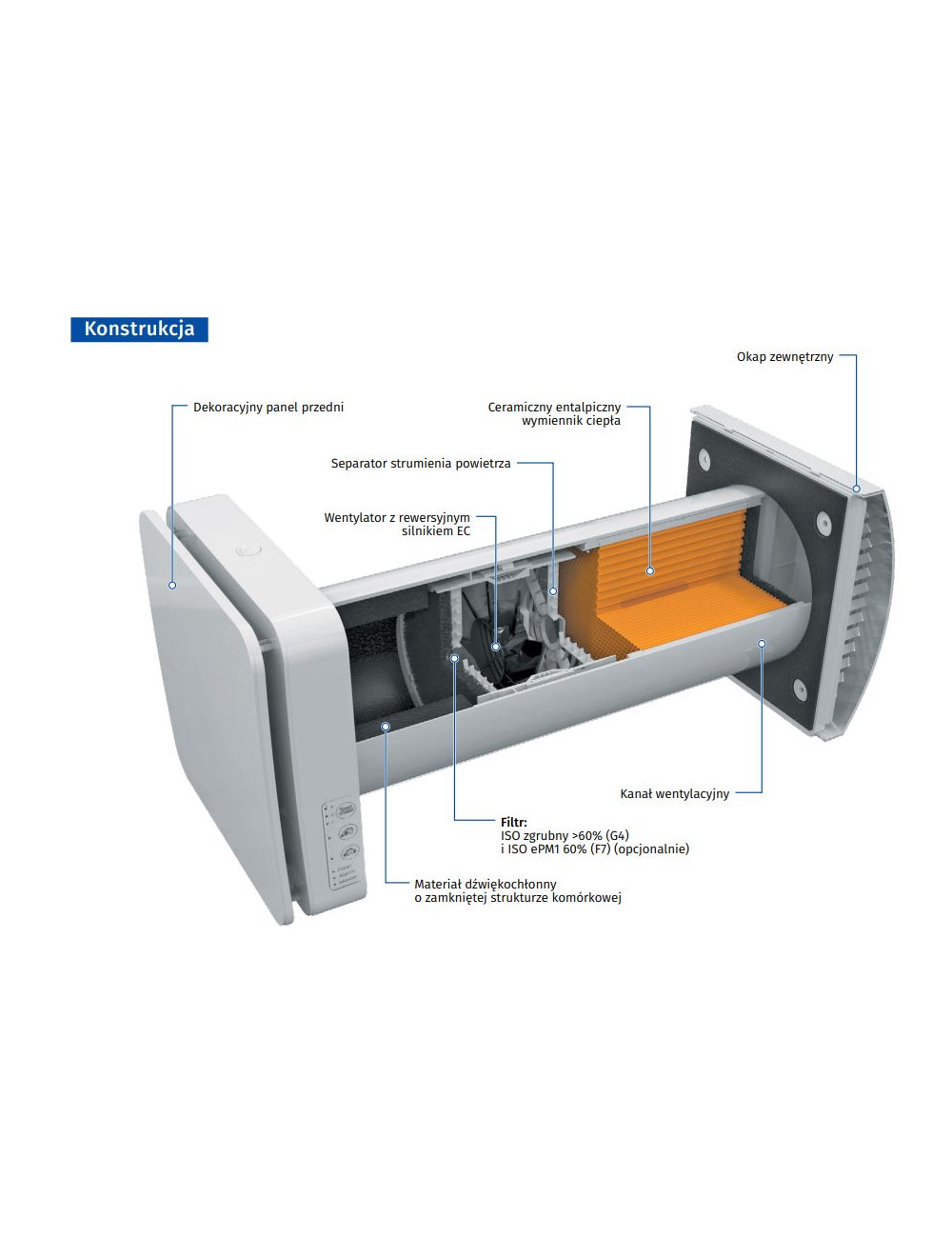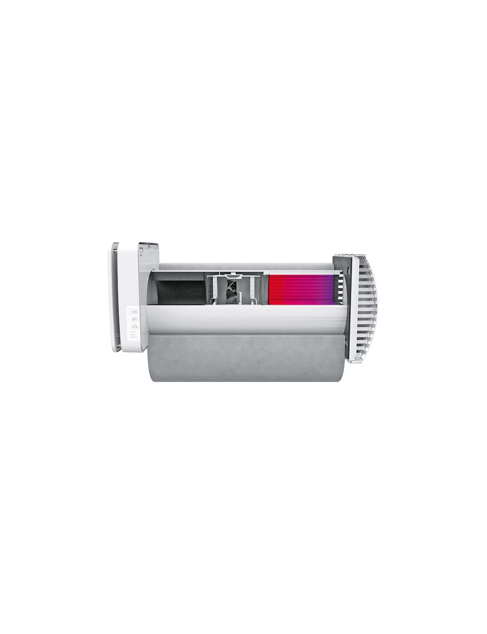 Kompaktowy moduł wewnętrzny składający się z wentylatora, wymiennika ciepła i filtrów o wysokiej klasie filtracji zapewni czyste i świeże powietrze. Wbudowany czujnik wilgotności pozwala na automatyczną kontrolę jakości powietrza w pomieszczeniu